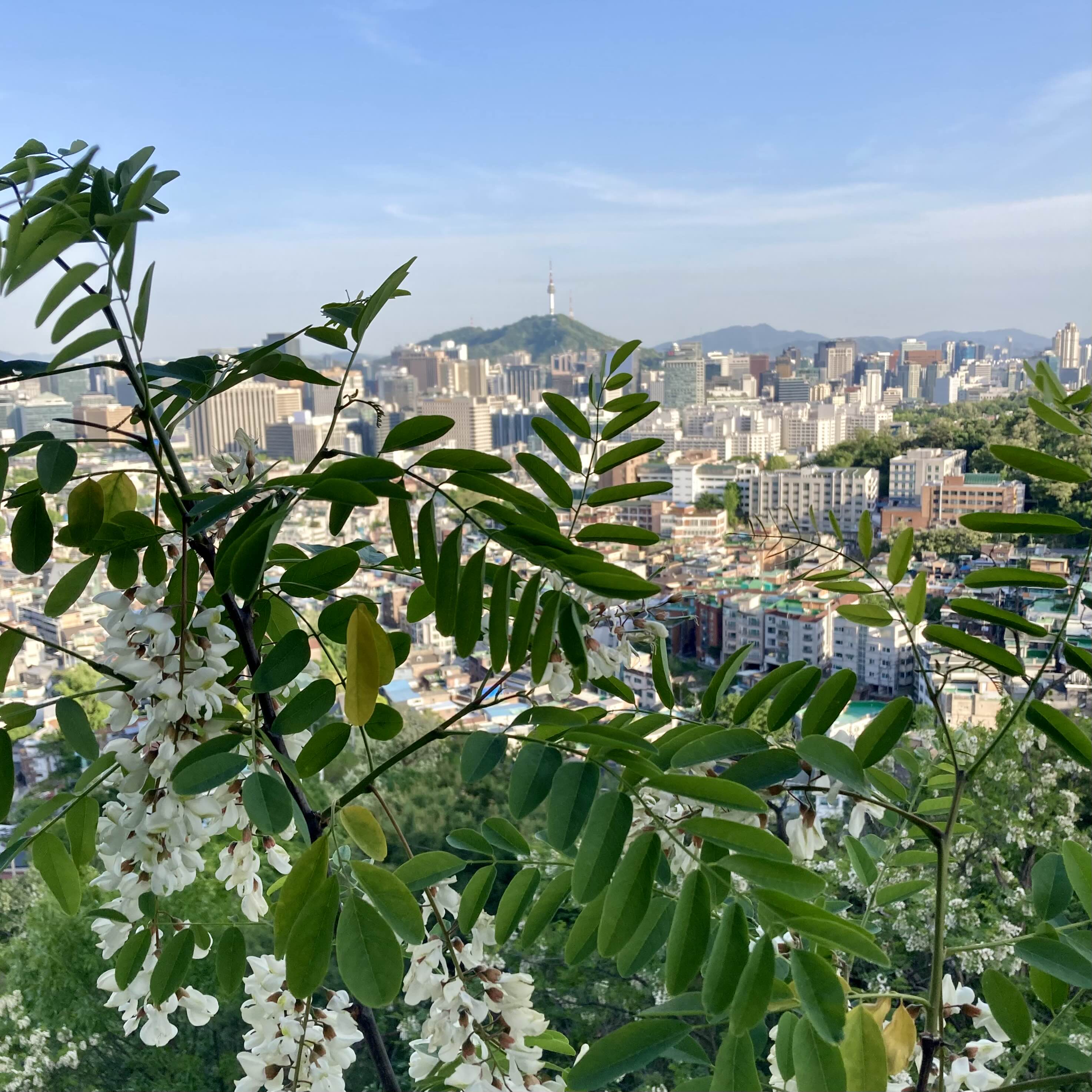 인왕산 자락길에 아까시나무 꽃이 한창이다.Black locust flowers are in full bloom at the Inwangsan Jarak-gil trail.