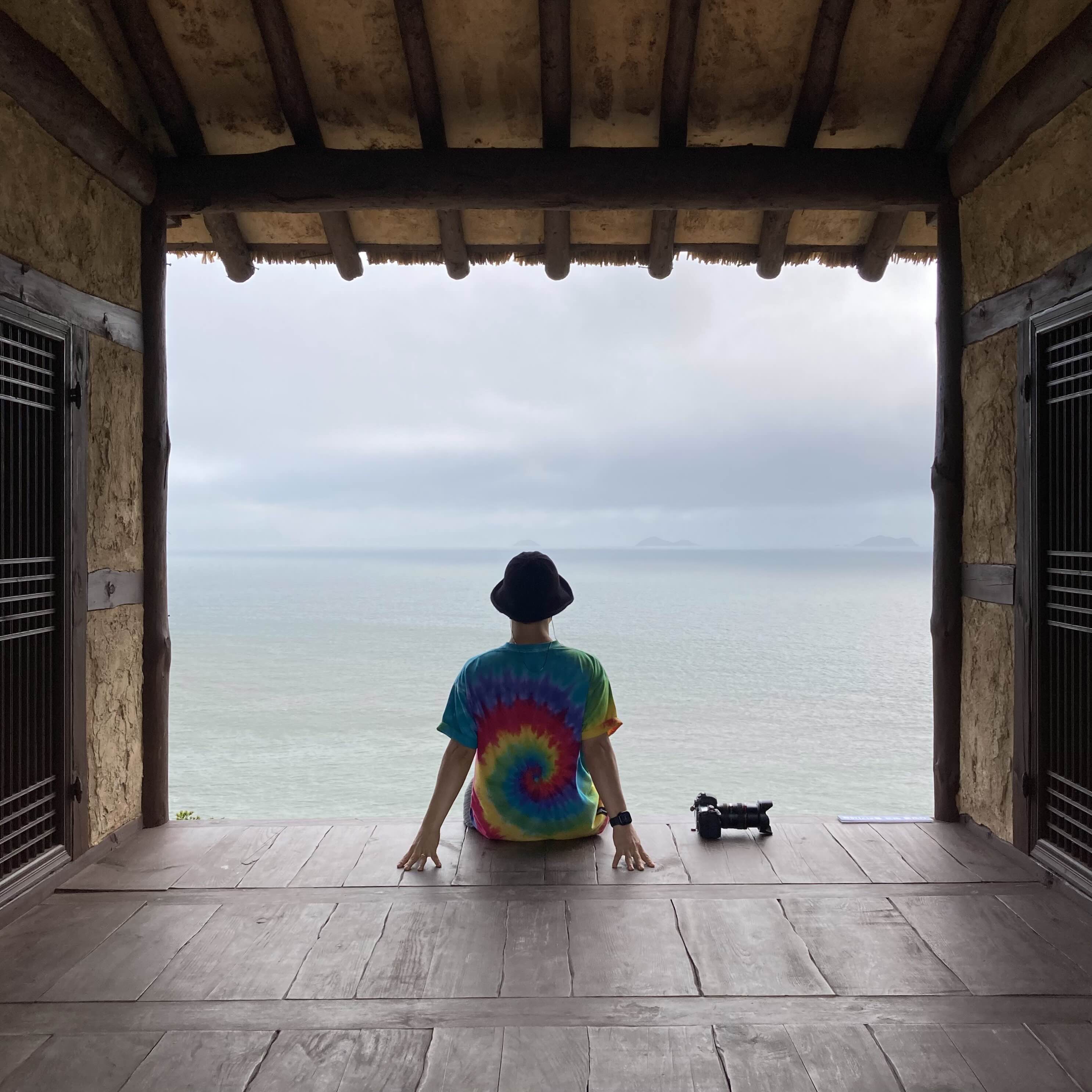 마루에 앉아 바다를 바라본다. 언덕에 바람이 휘몰아치는데 바다는 한없이 고요하고 아름답다.